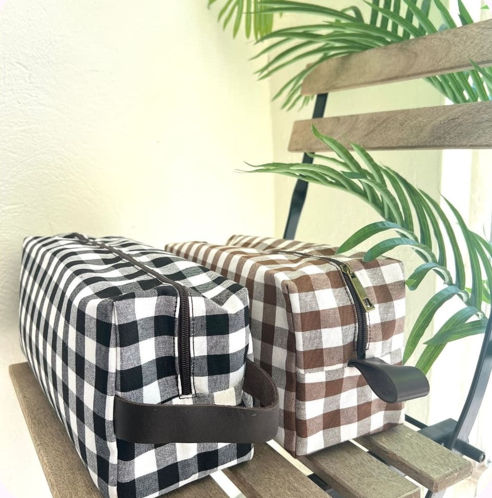 Colección de neceseres en tonos tierra, beiges y grises en patrón de cuadros vichy