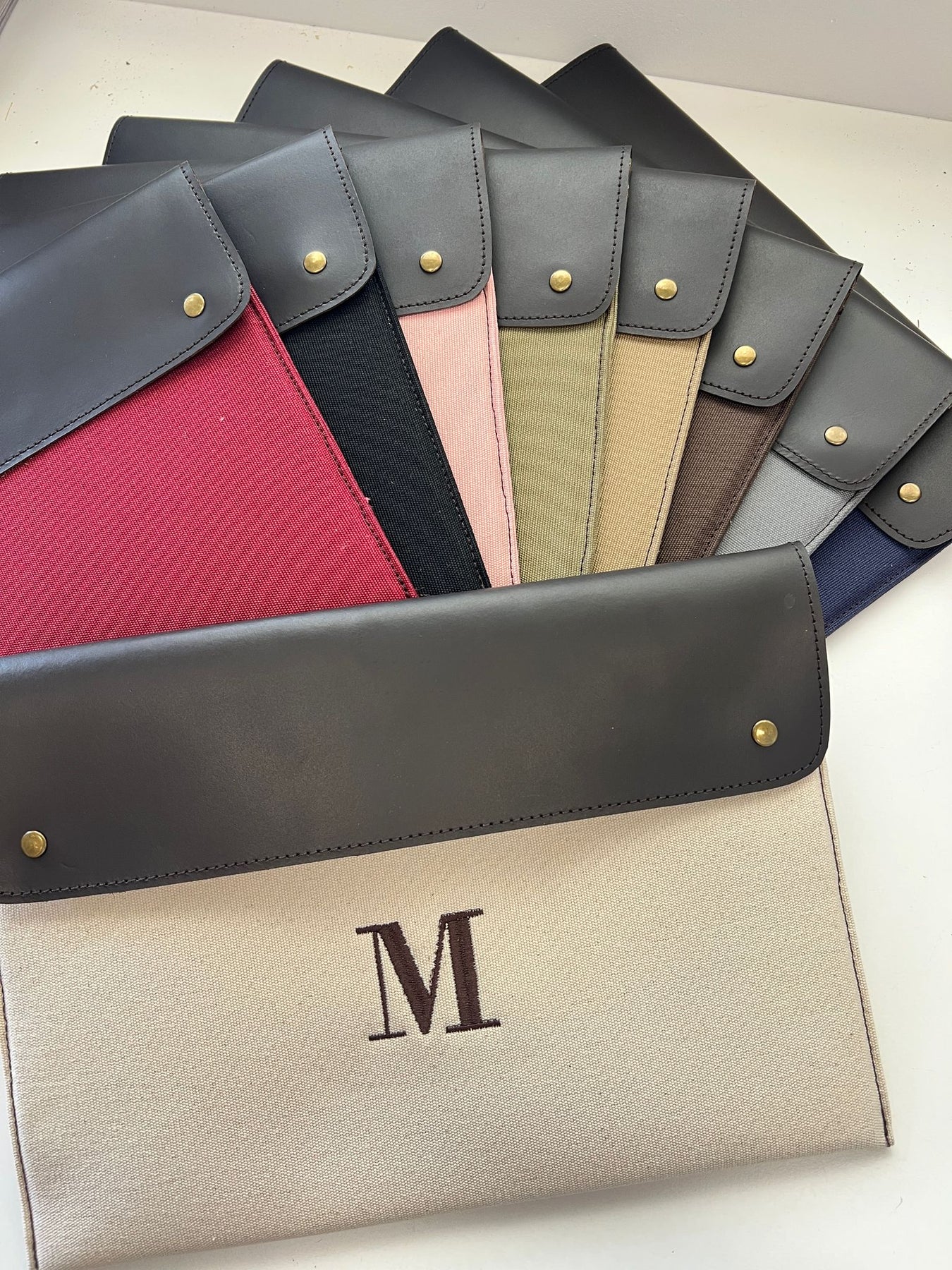 Porta-documentos Brate o Nilo 💼 de piel vegana, cierre a presión y capacidad A4. Bordamos su nombre, curso o frase motivadora en hilo premium. Modelo Nilo confeccionado con tejido canva y solapa de piel, igual que el modelo Brate.