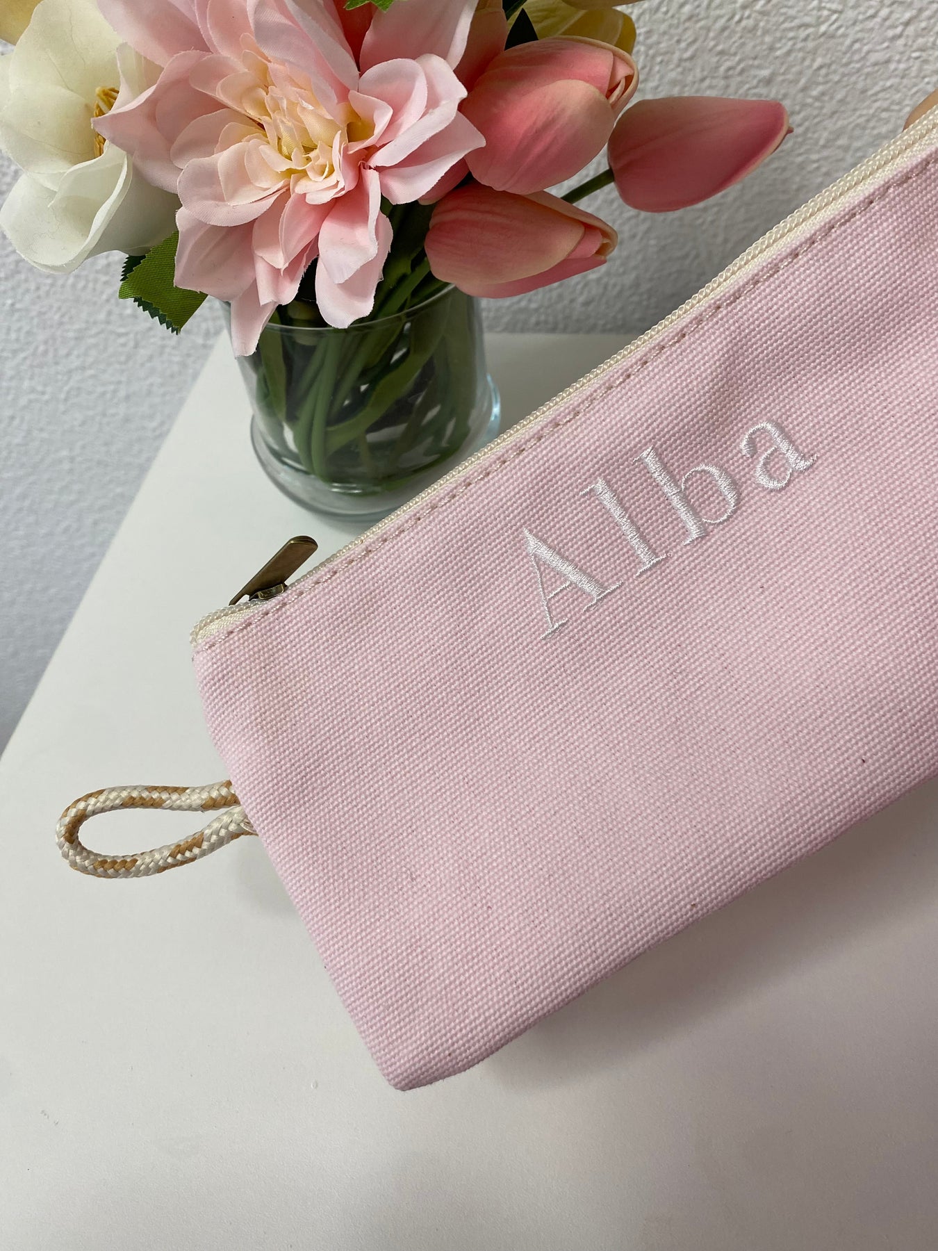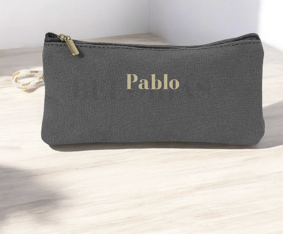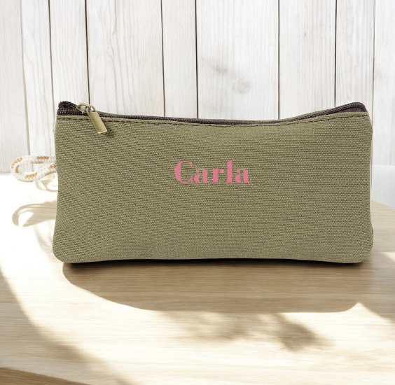 estuches en color beige con letras en rosa y color azul con letras en beige